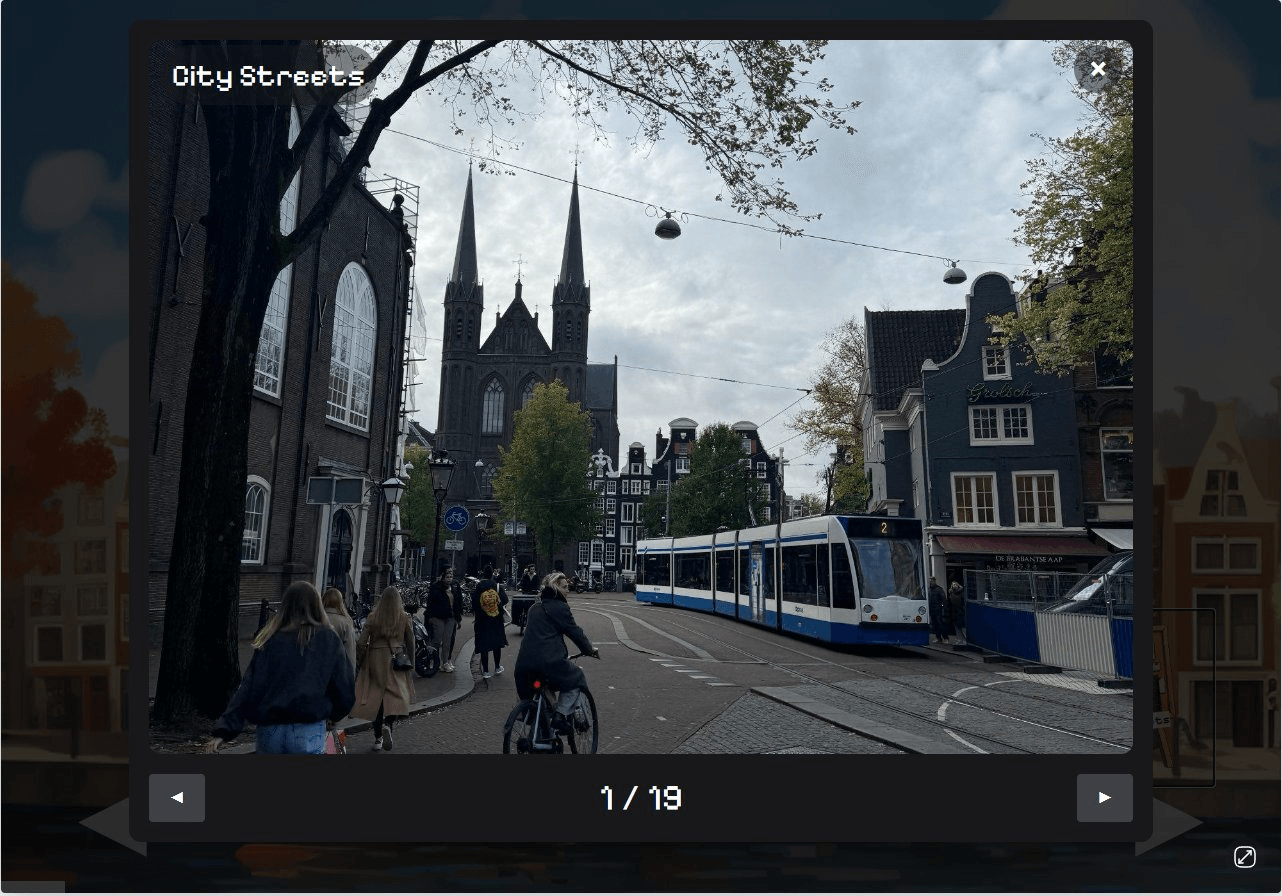 Back art November 7, 2023 View live Amsterdam Art Walk Use the arrow keys to walk through Amsterdam. Click through photos I took while there and interact with certain items. Next Photos.exe
