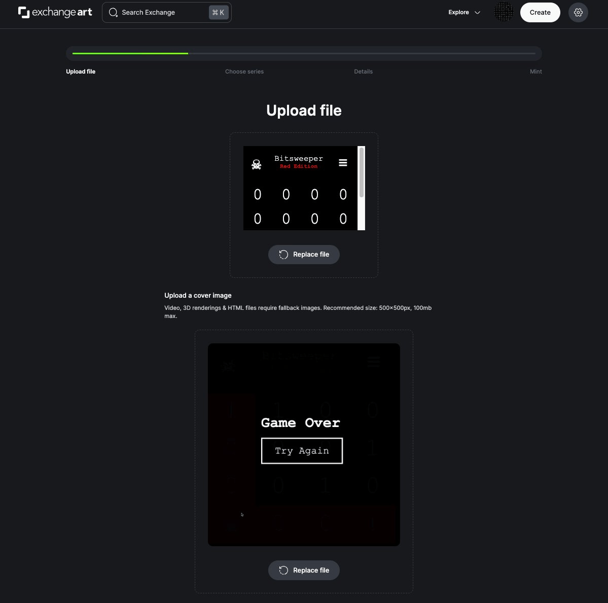 If we go to http://Exchange.art, they give us the ability to upload an HTML file. They also let you provide a cover image which acts as the fallback image for wallets and platforms that can't render the HTML version. I chose to use a .gif of gameplay as my cover image.