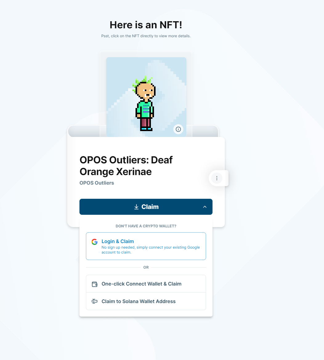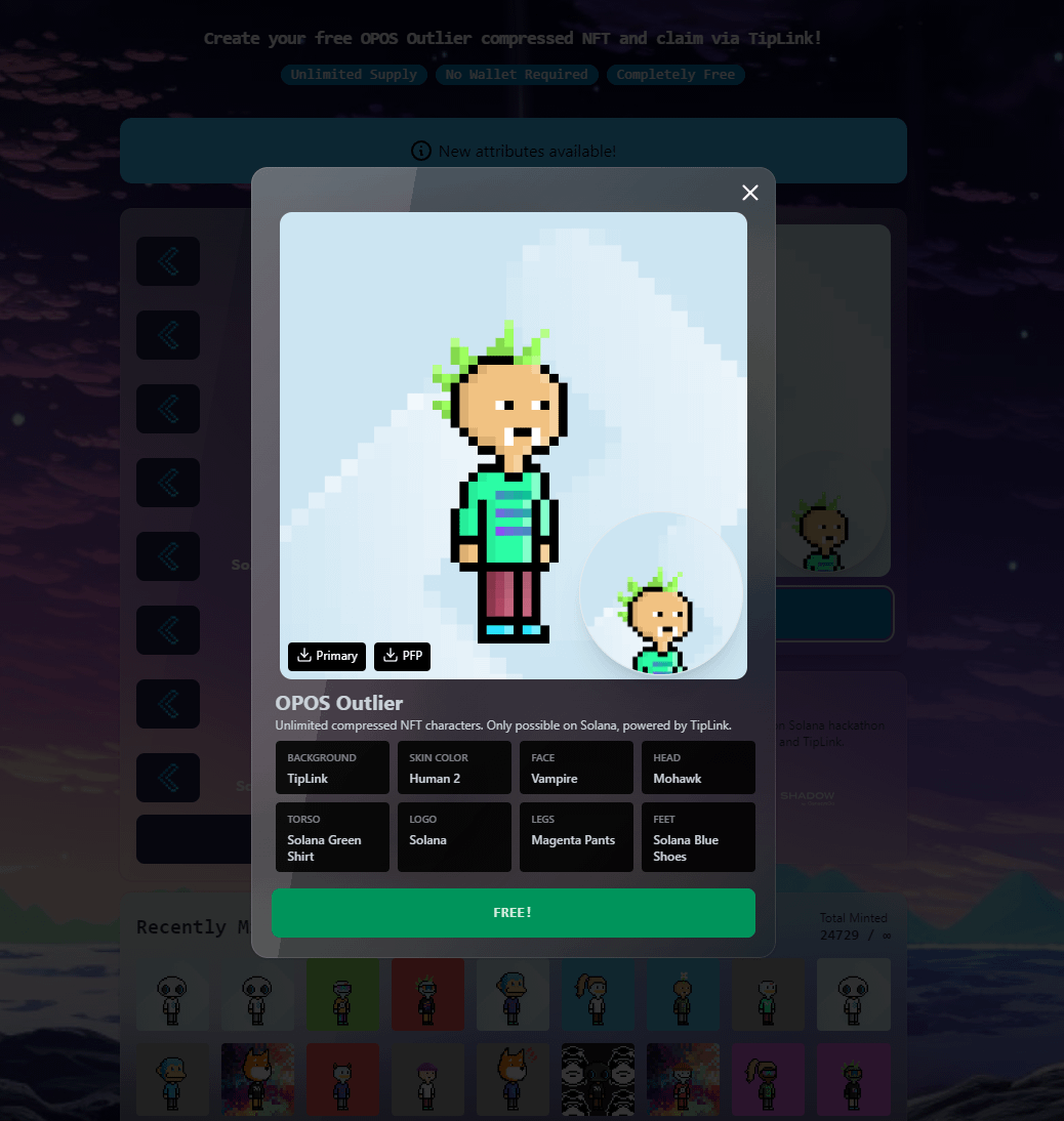 Mint a compressed NFT for free without a wallet using Solana and TipLink. Users are able to design an "OPOS Outlier" and mint it as a cNFT via Gmail-based claiming. The art and attributes were created by Web3 artists and brands.
